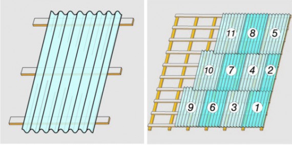 Układanie wykonuje się w kierunku przeciwnym do głównego kierunku wiatrów, od okapu do kalenicy. Celem uniknięcia docinania narożników lub zakładów poczwórnych, płyty należy układać z przesunięciem. Układanie należy rozpocząć w pierwszym rzędzie z calą płytą. W drugim rzędzie z połową płyty. Metoda ta kontynuowana jest naprzemiennie.